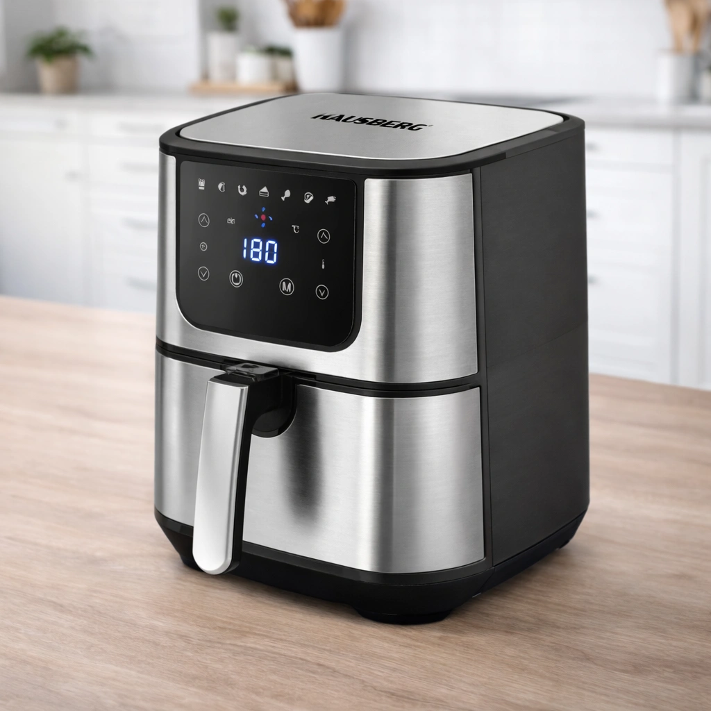 De Hausberg HB-2365 heteluchtfriteuse met een royale inhoud van 7 liter en een vermogen van 1600–1800W maakt het bereiden van grote, knapperige maaltijden mogelijk met weinig of geen olie. Ideaal voor gezinnen en intensief gebruik.
