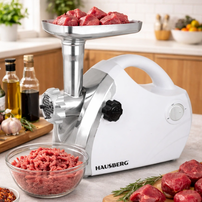 De Hausberg HB‑3430AB Elektrische Vleesmolen biedt kracht en gebruiksgemak voor het malen van vlees. Met een vermogen van 1800W verwerkt deze vleesmolen grote hoeveelheden vlees snel en efficiënt, waardoor hij perfect is voor zowel thuisgebruik als kleinschalige catering.