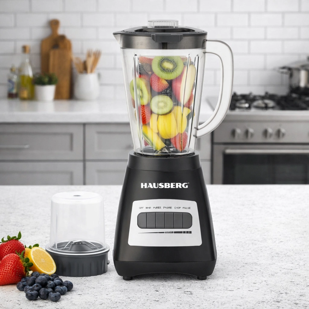 De Hausberg HB‑7772NG Elektrische Blender is ideaal voor het mixen en pureren van ingrediënten zoals fruit, groenten, sauzen en smoothies. Met een vermogen van 400–500W is deze blender geschikt voor lichte tot middelzware bereidingen, waardoor hij perfect is voor dagelijks gebruik in de keuken.